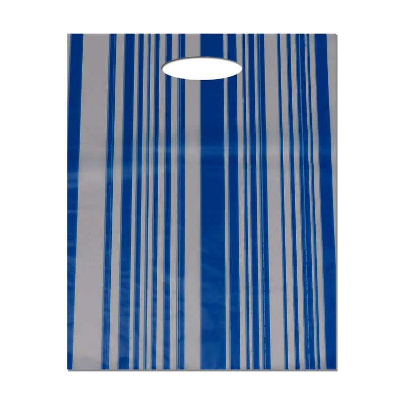 Bolsa de plástico estampada, con fondo blanco y rayas azules.