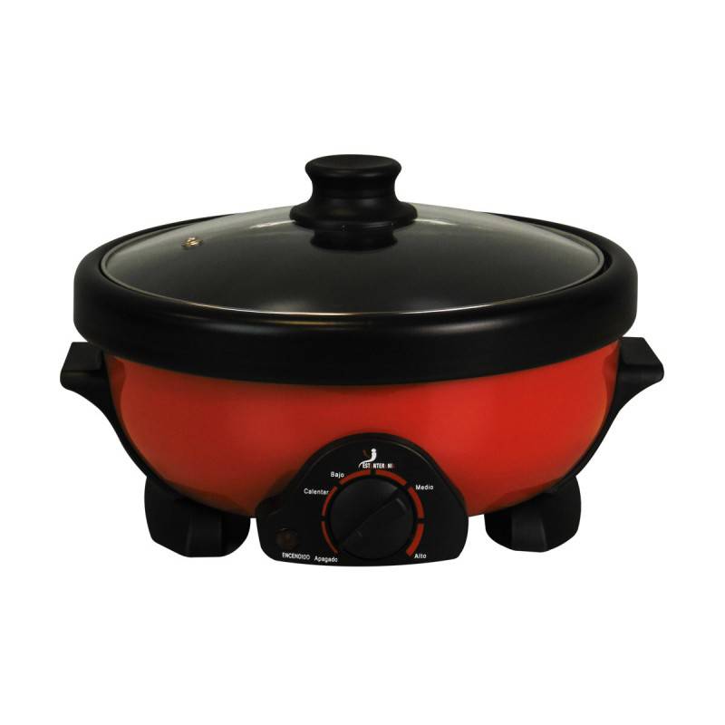 Cazuela eléctrica de 1300W, disponible en tres colores (rojo, blanco y metalizado). Incluye tapa de cristal y cuchara.