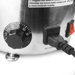 Incluye un selector de temperatura, de 30º a 150º, que evita el deterioro del chocolate (una vez fundido, hay que bajar la temperatura para mantenerlo caliente, peso sin quemarse).