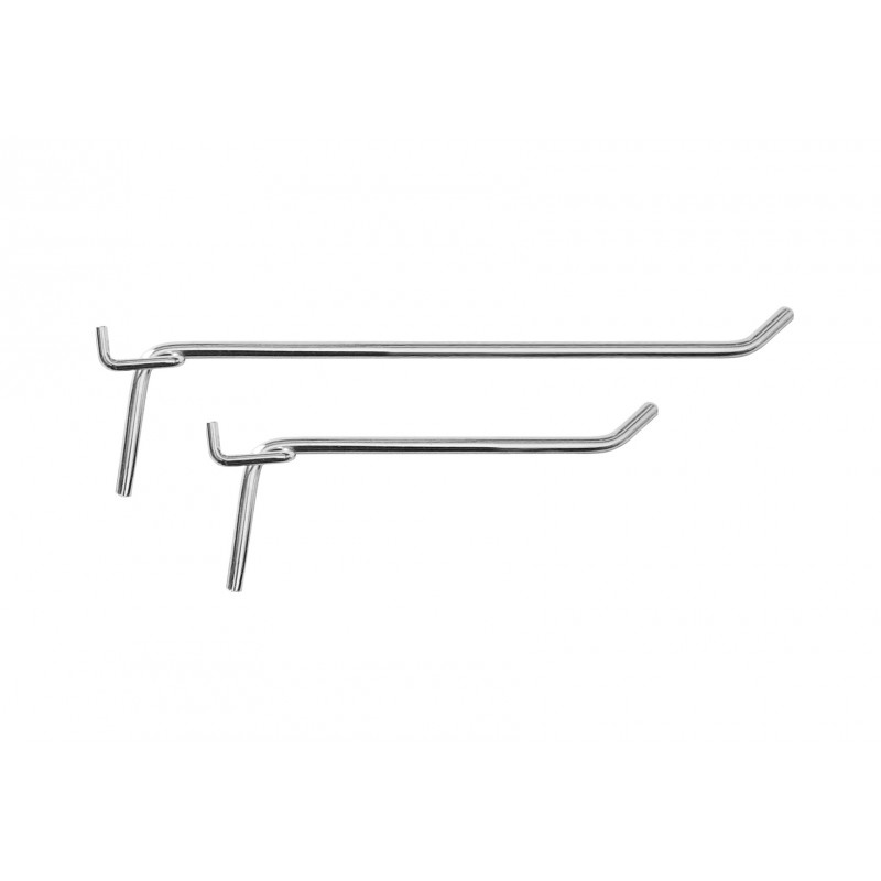 Gancho metálico para panel perforado, con un grosor de entre 5 y 6 mm. Disponible en varias longitudes: 10, 15, 20, 25, 30, 35 y 40 cm.