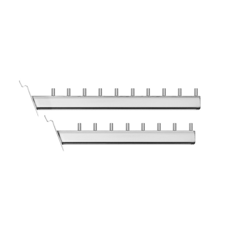 Gancho metálico grueso para panel de lamas. Es un gancho inclinado y dispone de topes superiores. Disponible en varias longitudes: 25 cm (7 topes), 30 cm (8 topes), 35 cm (9 topes) y 40 cm (10 topes).