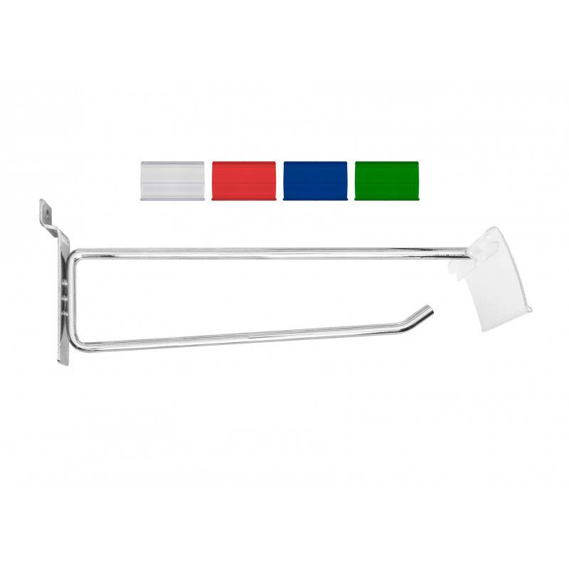 Gancho para tablero de lamas con portaprecios. Los portaprecios están disponibles en color azul, rojo, verde y transparente.