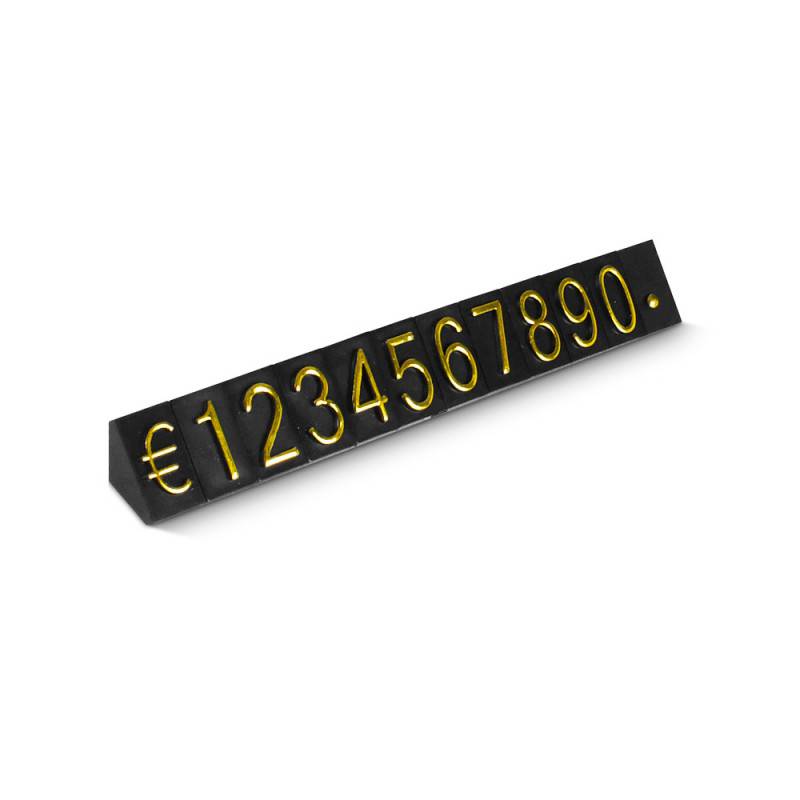 Piezas de plástico para precios. Fondo negro y números dorados.
